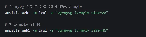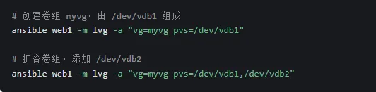 创建卷组:使用 lvg 模块,将一个或多个 PV 加入卷组(VG)。