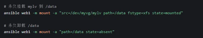 absent:永久卸载(从 /etc/fstab 中删除配置)
