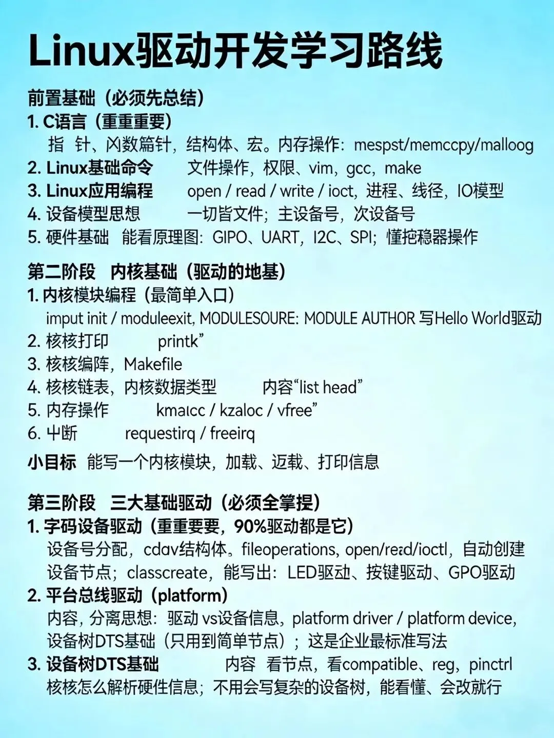 干了好几年应用开发,想往底层走,又怕门槛太高?驱动开发、内核编程,听起来就像另一个世界。别怕,今天这份路线图,就是给你这样的“想转底层又不敢”的人准备的。你会的C语言、Linux命令、硬件基础,全是驱动开发的底子。转底层不是从零开始,是升级赛道。你写的应用代码,驱动里也有;你调过的接口,驱动里也类似。缺的只是那层窗户纸。