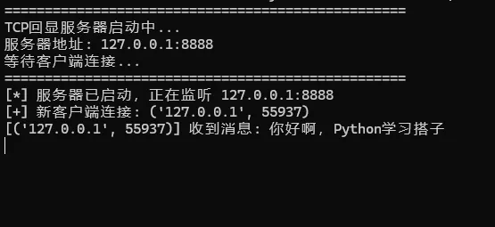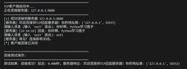 # 终端1:启动服务器python tcp_echo_server.py# 终端2:启动客户端python tcp_echo_client.py# 终端3:启动另一个客户端(测试多客户端)python tcp_echo_client.py