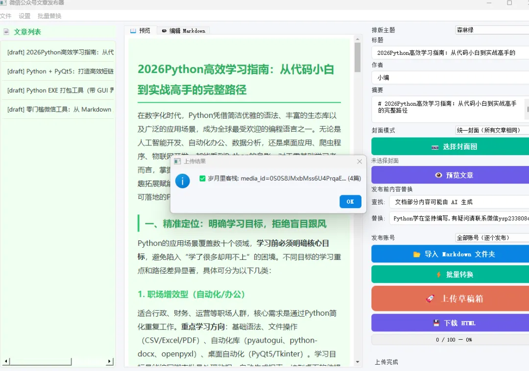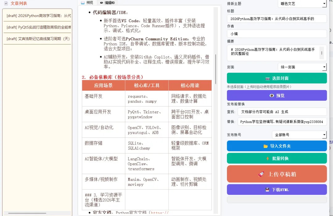 今天给大家带来一款自研Python可视化工具——微信公众号文章发布器(精简版)!它基于PyQt5打造,界面精致高级、不透明超好看,功能全覆盖,无需复杂配置,小白开箱即用,还能一键打包成独立exe,随时随地使用。工具剔除了敏感账号密码,安全可靠,支持8种高颜值排版主题、批量转换、批量上传、多账号管理、批量替换,彻底解放你的双手,让公众号创作回归内容本身!