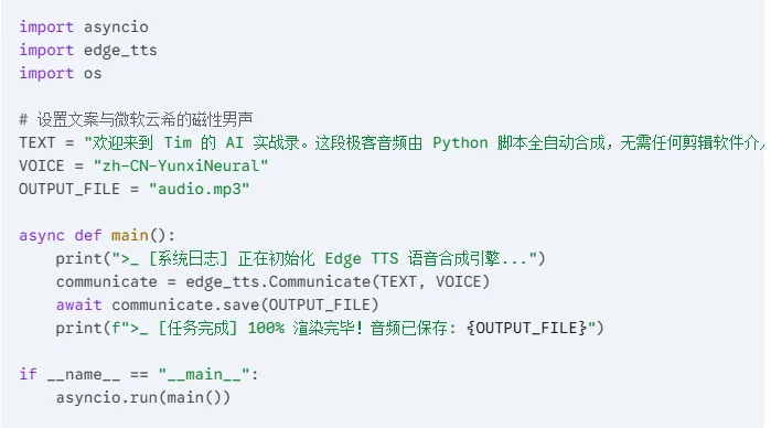 文案有了,我们需要一个极具质感的声音把它读出来。放弃那些收费的配音软件吧,我们直接用 Python 调用微软免费的 Edge TTS 引擎。