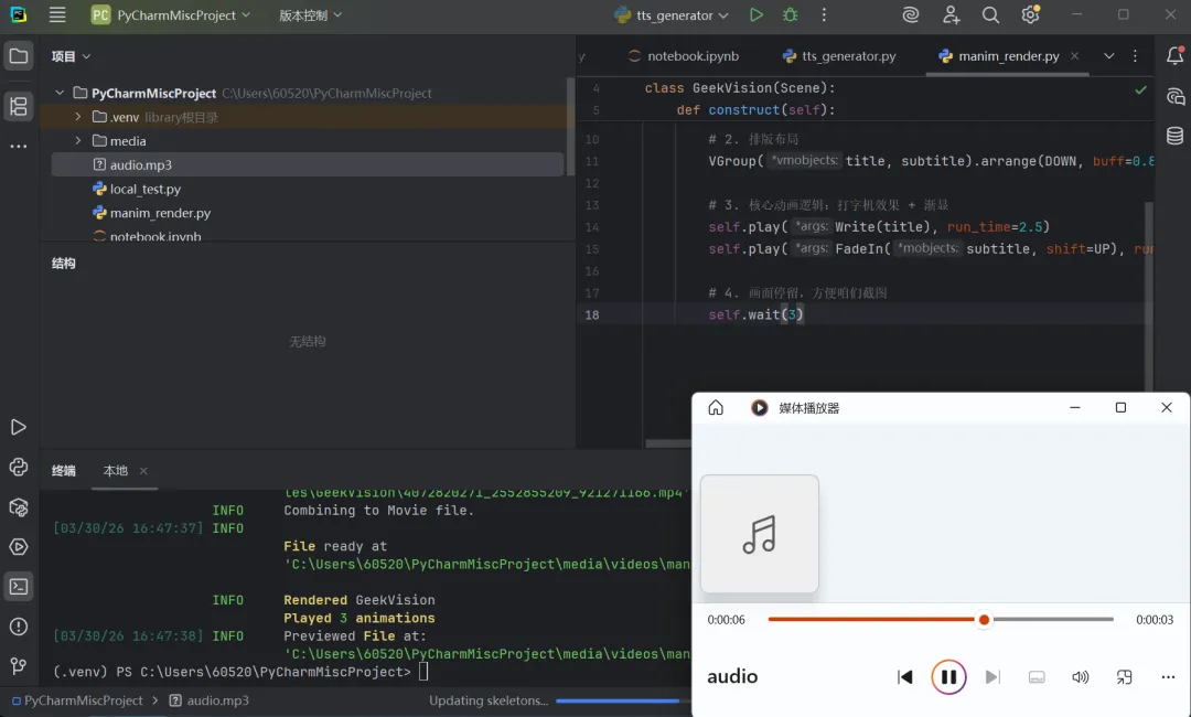 这段代码跑完的瞬间,你的项目目录里就会凭空多出一个 audio.mp3。这才是最高效的“静默生产”。