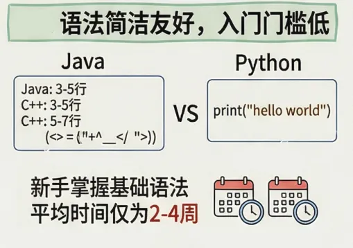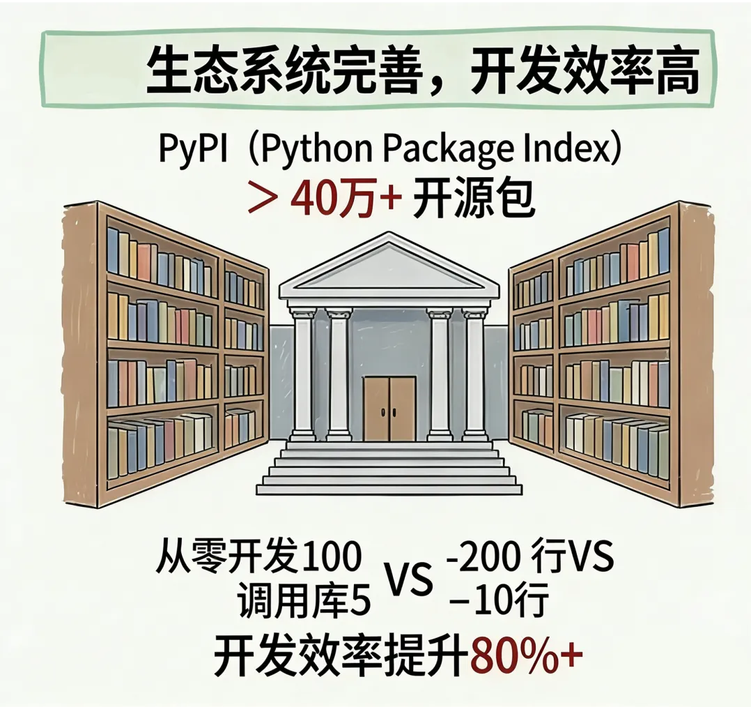 语法简单(零基础 2 周入门)、生态丰富(40 万 + 开源库)、应用范围广、薪资高于行业平均(18.6k / 月,超 30%)、跨平台兼容。