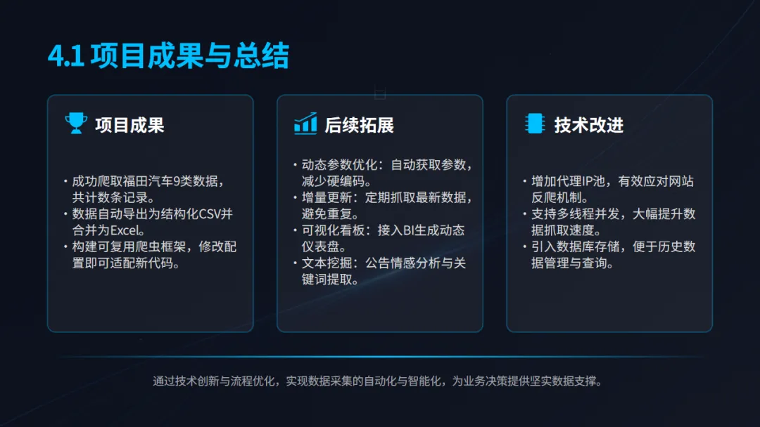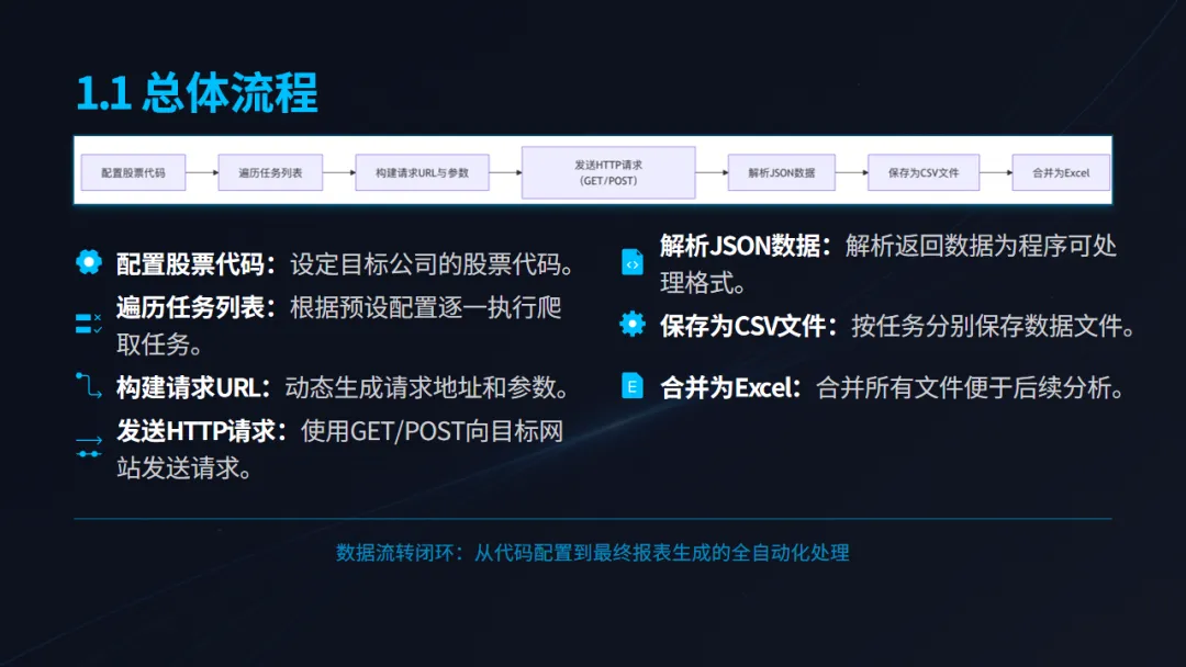 周希妍同学的项目核心是构建一个自动化、可复用的数据获取与分析管道。项目成功抓取了巨潮资讯网的公开数据,其技术框架包含以下几个关键模块: