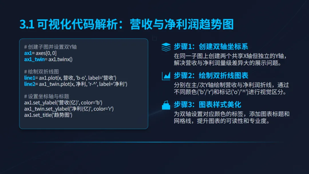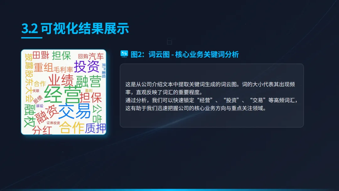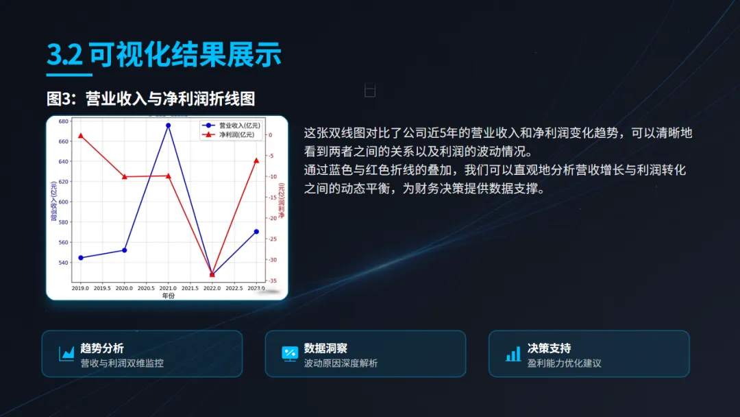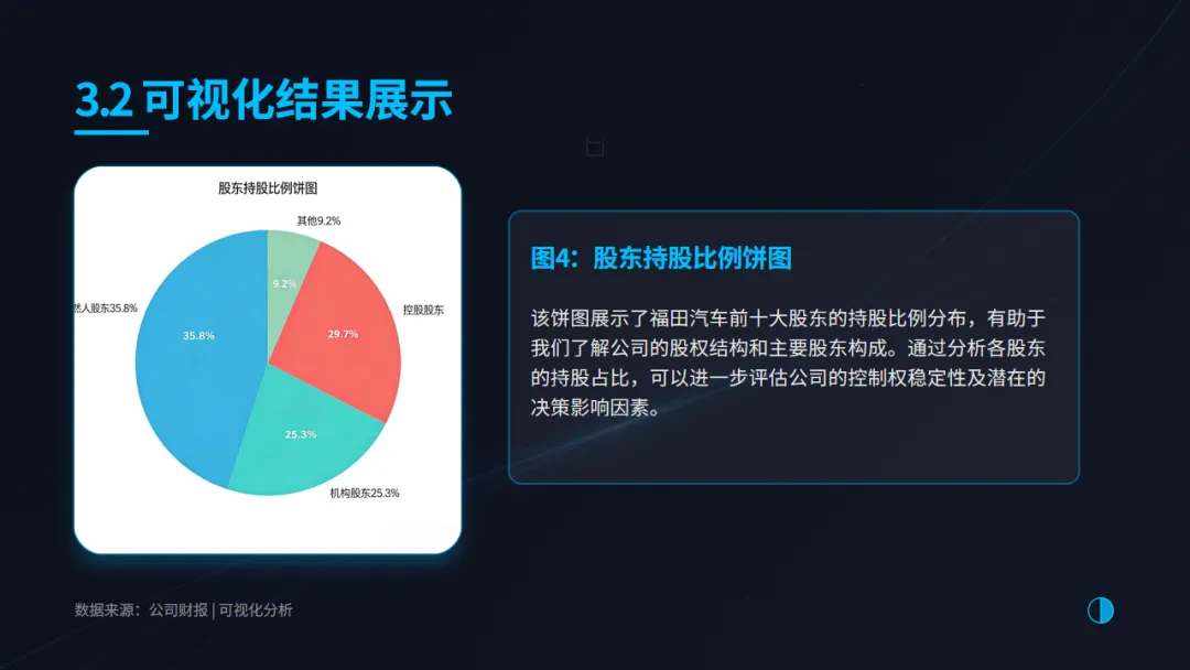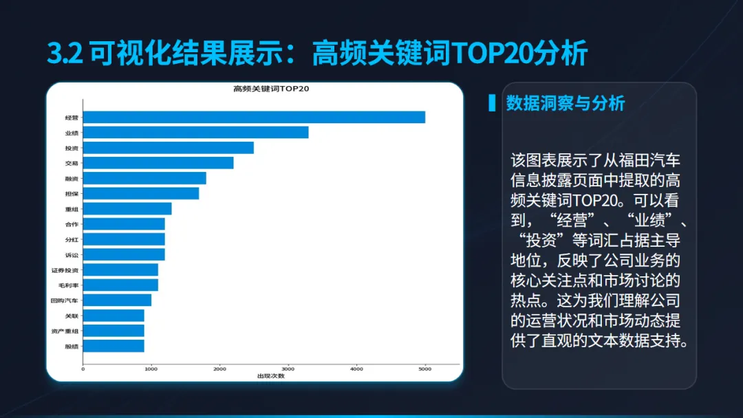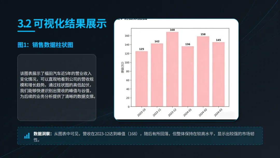 获取数据仅是第一步,如何让数据“说话”更为关键。项目利用多种可视化工具,对上市公司(以福田公司为例)的经营状况进行了多维度的直观呈现: