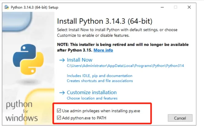 安装选项勾选:在安装 Python时,建议勾选界面中的两个关键选项,以避免新手因环境变量未配置而导致的“找不到 Python 路径”等问题。