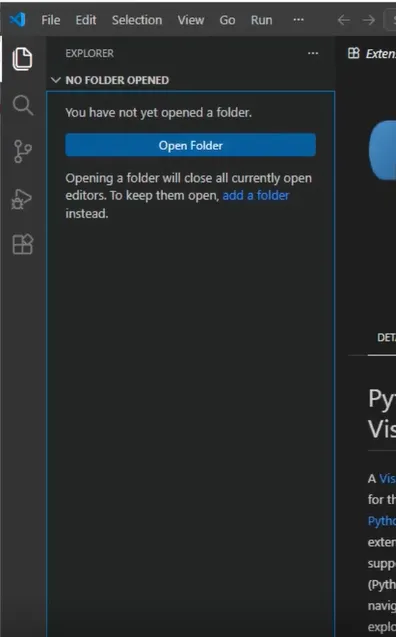 在环境准备就绪后,点击右边的Explorer,也可以按Ctrl+shift+E,回到文件浏览器界面。这时候应该是空的,会提示我们打开一个文件夹。