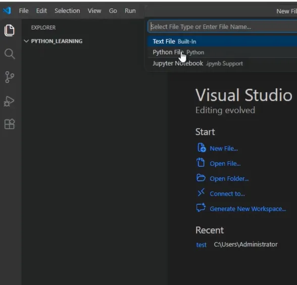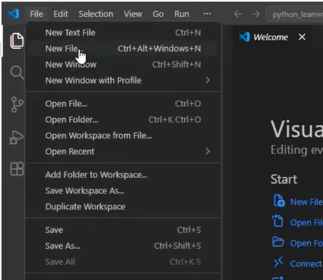 工作区建立:建议创建名为“python_learning”的专用文件夹,并通过 VS Code 的“Open Folder”功能打开该目录,以建立项目工作区。
