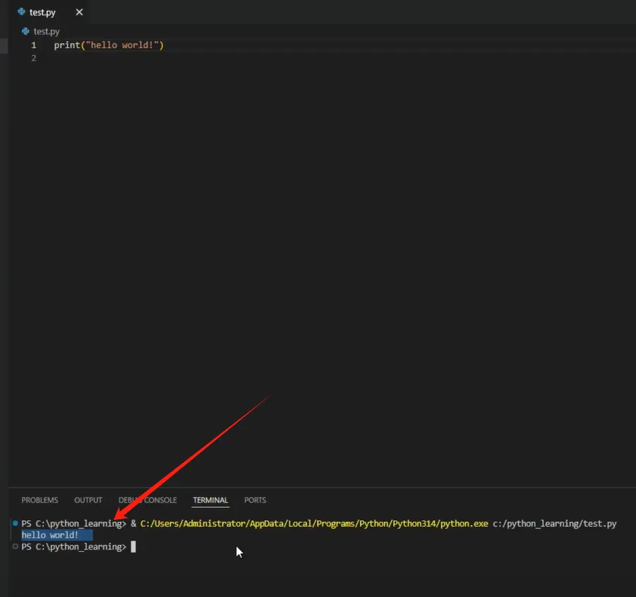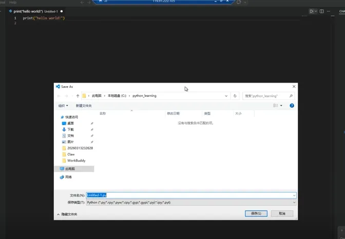 执行与结果:在 VS Code 中直接运行程序,会提示要保存文件,选择保存为 `.py` 后缀的 Python 文件(如 test.py),终端成功输出了“hello world”字符串,标志着开发环境配置成功且程序可正常执行。