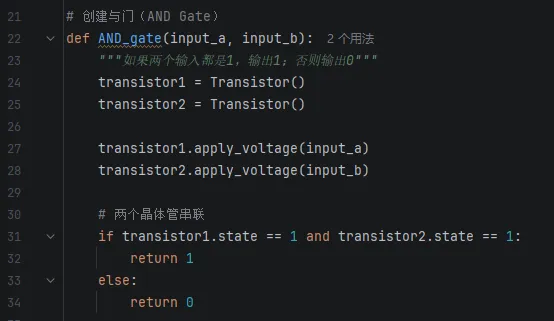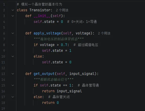 以上代码模拟晶体管的基本行为,比如施加电压控制晶体管的状态01。根据01状态输出电信号。