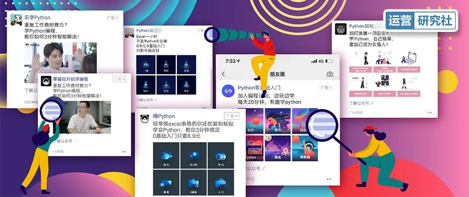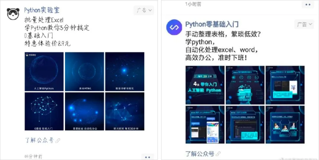 为了深扒 Python 小课的文案套路,我翻遍了朋友圈、公众号、抖音,看了近百条广告发现,为了吸引用户的点击,“Python 小课”可以说是费尽了心机。