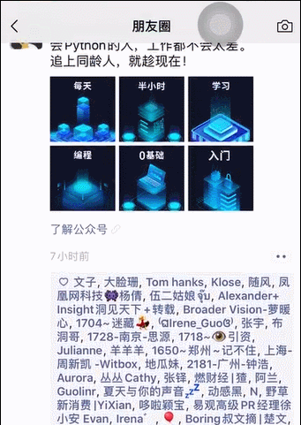 仔细观察你会发现,“Python 小课”的朋友圈广告,一般都是 2~4 行左右的短文案加上九宫格折叠页图片(或者小视频),我们逐一拆解。