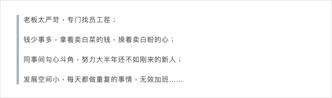 钱多事少、努力不如新人、发展空间小、每天做重复的事、无效加班……