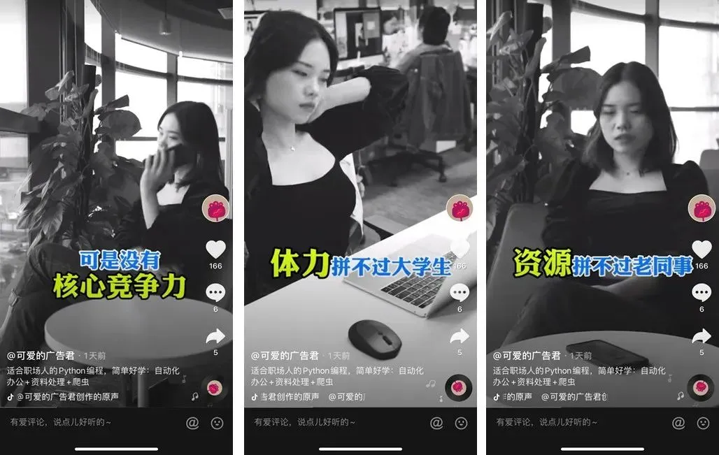 同样地,抖音短视频是这样戳用户痛点的,比如在职场上没有竞争力,体力拼不过大学生、资源拼不过老同事等等。
