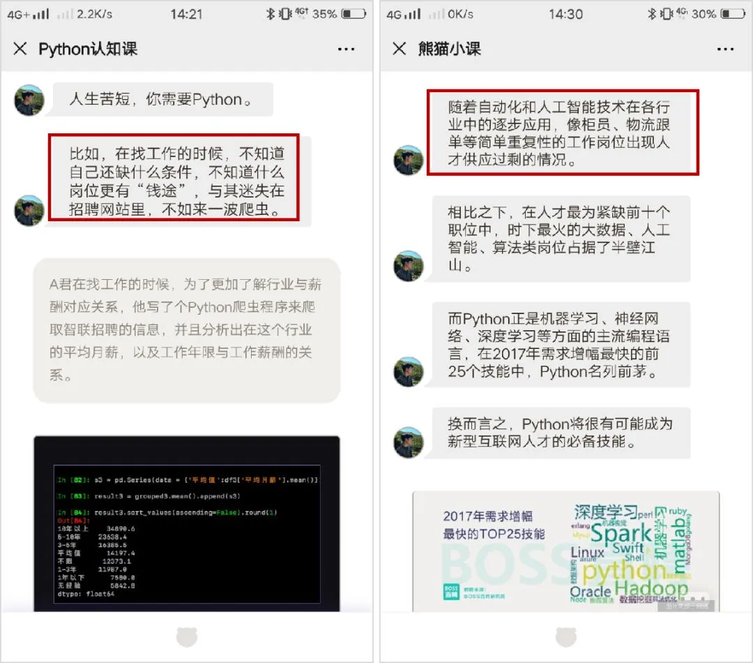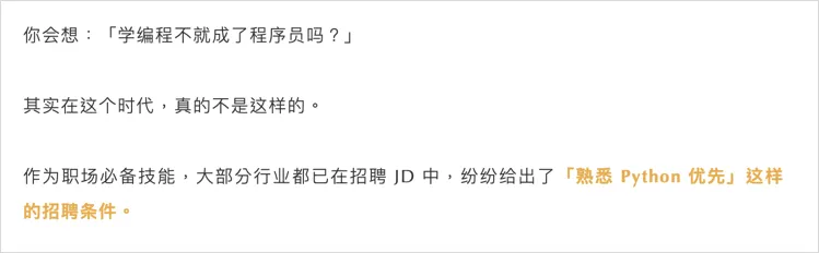 第 1 步就是吸引用户注意。Python 小课广告的标题和开头很擅长制造焦虑,都是紧扣目标用户心理的相关话题。