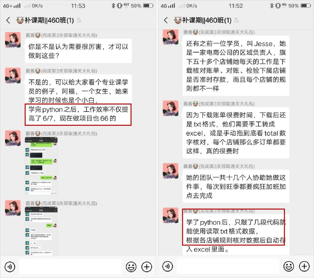 比如助教在群聊里会时不时地晒一些学员案例,强调学之前有多菜鸟,学了之后有多牛逼,工作效率有多高等等。
