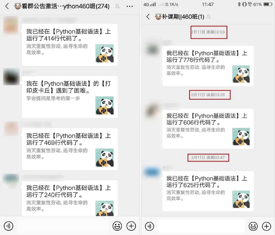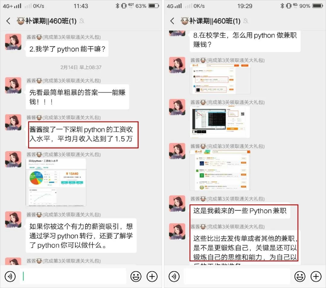 班主任会让学员们在学习完一关之后,将代码的运行结果发到群里,发送了的学员都可以获得课程资料包的奖励。