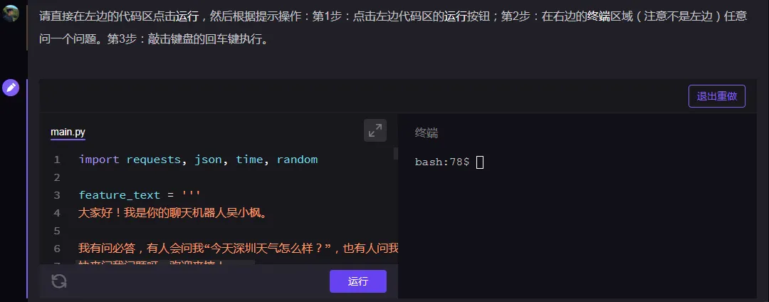 课程中还会设置一些比较简单的操作,比如让你在括号中打上老师给你准备好的内容,你只要点击“运行”就能出来结果,可以说是成就感满满了。