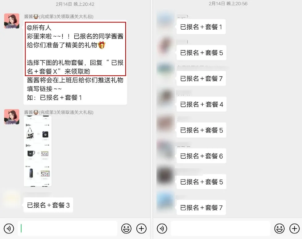 除了课程组合价和优惠券之外,更秀的是报名的学员可以领取雨伞、帆布包等小礼物。助教以统计礼物的名义,让用户在群里接龙晒单,营造出课程热卖的氛围,试图利用用户的从众心理做进一步转化。