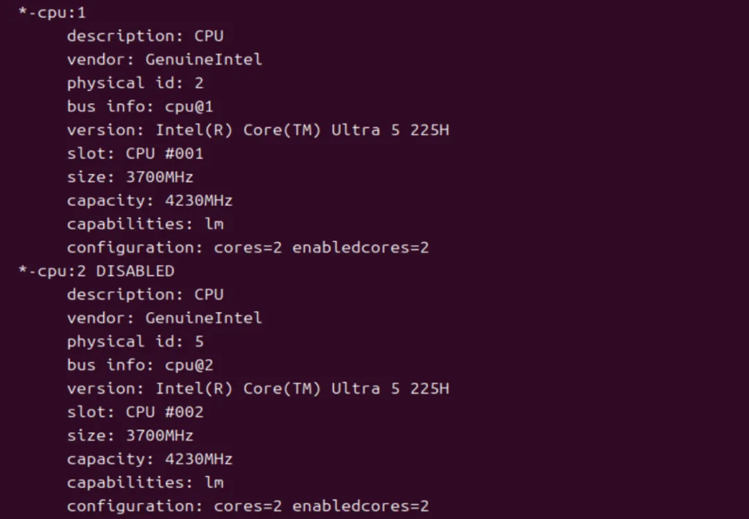 命令会输出每个 CPU 核心的详细独立信息,包括物理核心、逻辑核心(超线程)都会分别展示。若当前计算机 CPU 核心数为 12,核心编号依次为 cpu:0、cpu:1……,下图中第一张为 cpu:0 的信息,第二张为 cpu:1 和 cpu:2 的信息。