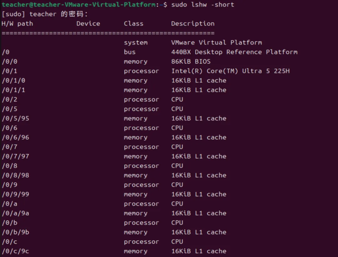 注意:大部分硬件查询命令需要管理员权限,普通用户需要在命令前面加sudo,用于提升执行权限,不需要管理员权限的命令就可以省略sudo。