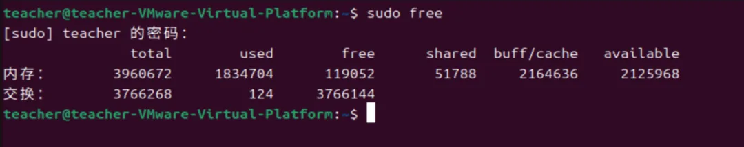 free列:完全未被使用的纯空闲内存,大约0.11GB,数值很小是正常的,因为 Linux 会尽量利用空闲内存做缓存。交换内存大约3.76G,说明交换区还有很大的存储空间。