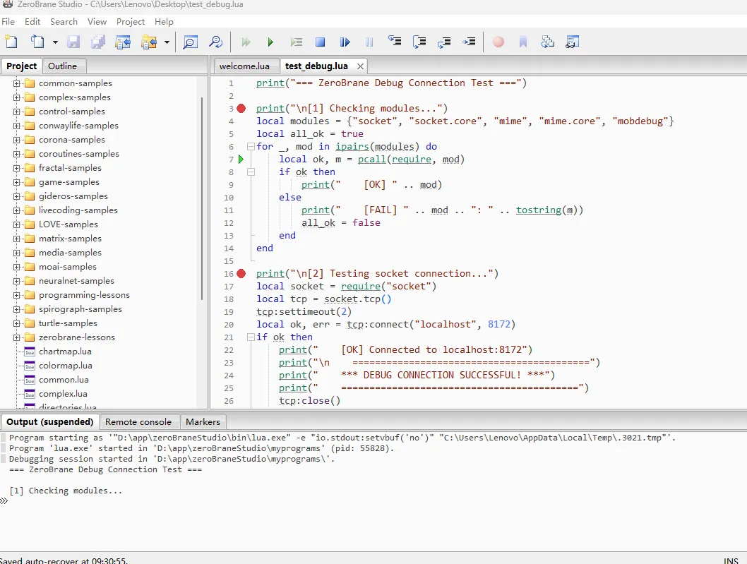 - 断点调试: 在 ZeroBrane 中设置断点,程序会暂停
