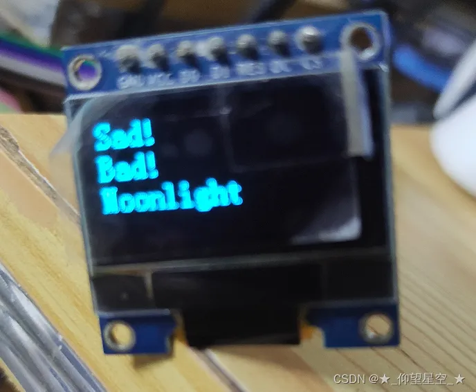 测试程序 # include "stdio.h" # include <sys/types.h> # include <sys/stat.h> # include <fcntl.h> # include <unistd.h> # include <stdio.h> # include <string.h> # include <sys/ioctl.h> # include <poll.h> # include <stdint.h> # include <stdlib.h> # include "oled_def.h" # include "font.h" # define DEV_NAME "/dev/oled" int oled_fd; void sleep_ms ( unsigned int ms) { struct timeval delay ; delay.tv_sec = 0 ; delay.tv_usec = ms * 1000 ; select( 0 , NULL , NULL , NULL , &delay); } void oled_disp_char ( int x, int y, unsigned char c) { int i = 0 ; /* 得到字模 */ const unsigned char *dots = oled_asc2_8x16[c - ' ' ]; char pos[ 2 ]; # if 0 /* 发给OLED */ OLED_DIsp_Set_Pos(x, y); /* 发出8字节数据 */ for (i = 0 ; i < 8 ; i++) oled_write_cmd_data(dots[i], OLED_DATA); # endif pos[ 0 ] = x; pos[ 1 ] = y; ioctl(oled_fd, CMD_COMBINE(OLED_CMD_SET_XY, 2 ), &pos); ioctl(oled_fd, CMD_COMBINE(OLED_CMD_WRITE_DATAS, 8 ), dots); # if 0 OLED_DIsp_Set_Pos(x, y+ 1 ); /* 发出8字节数据 */ for (i = 0 ; i < 8 ; i++) oled_write_cmd_data(dots[i+ 8 ], OLED_DATA); # endif pos[ 0 ] = x; pos[ 1 ] = y+ 1 ; ioctl(oled_fd, CMD_COMBINE(OLED_CMD_SET_XY, 2 ), pos); ioctl(oled_fd, CMD_COMBINE(OLED_CMD_WRITE_DATAS, 8 ), &dots[ 8 ]); } void oled_disp_string ( uint8_t x, uint8_t y, char *str) { uint8_t j = 0 ; while (str[j]) { oled_disp_char(x, y, str[j]); /* 显示单个字符 */ x += 8 ; if (x > 127 ) { x = 0 ; y += 2 ; } j++; /* 移动显示位置 */ } } static void oled_test ( void ) { oled_disp_string( 0 , 0 , "Sad!" ); oled_disp_string( 0 , 2 , "Bad!" ); oled_disp_string( 0 , 4 , "Moonlight" ); } int main ( int argc, char **argv) { int ret; /* 2. 打开文件 */ oled_fd = open(DEV_NAME, O_RDWR | O_NONBLOCK); // | O_NONBLOCK if (oled_fd < 0 ) { printf ( "can not open file %s, %d\n" , DEV_NAME, oled_fd); return -1 ; } oled_test(); sleep_ms( 5000 ); close(oled_fd); return 0 ; } 测试: