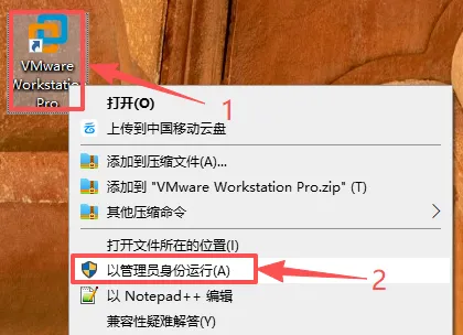 2.找到桌面上的 VMware 图标,右键选择「以管理员身份运行」。