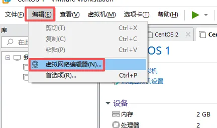 1.打开 VMware 后,点击顶部菜单栏的「编辑」→「虚拟网络编辑器」,打开配置窗口;