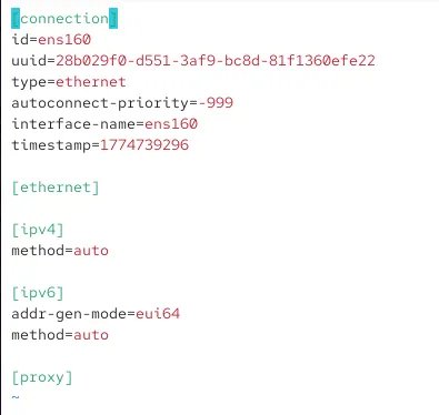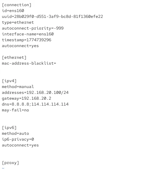 打开网卡配置文件vim /etc/NetworkManager/system-connections/ens160.nmconnection |