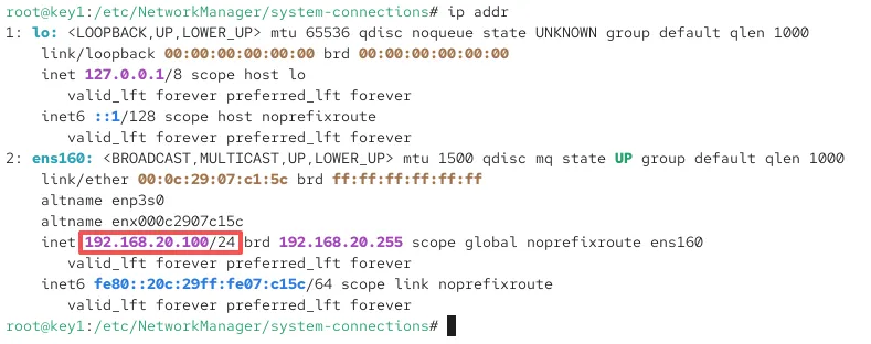 1.先验证网卡配置是否生效输入命令ip addr,回车后就能看到我们配置的 IP 地址192.168.20.100已经出现在网卡信息里了,说明配置文件生效了。