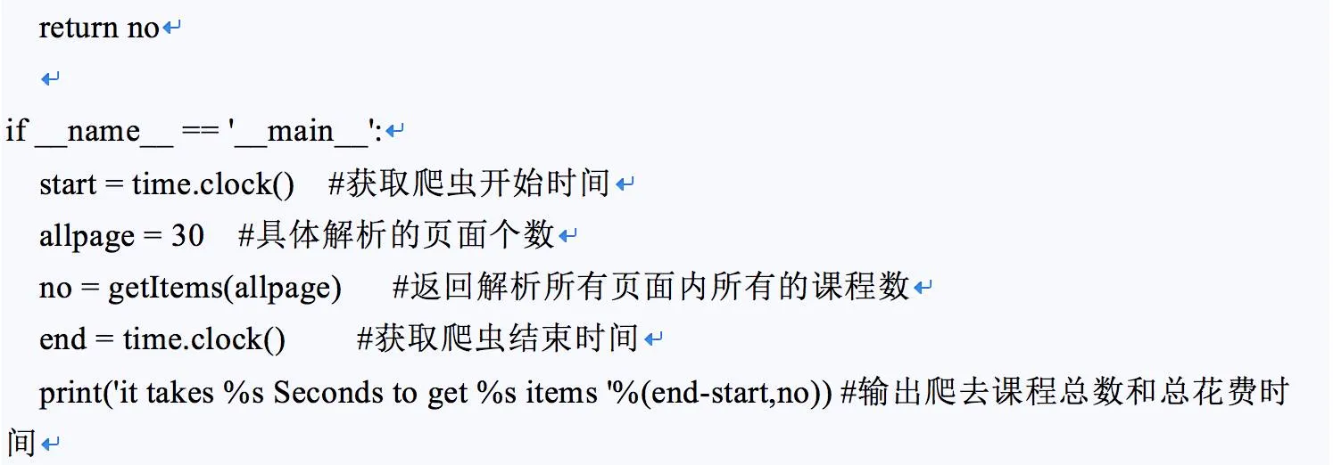 整个代码逻辑较为简单,被爬网页url后缀为页面,单线程版中通过for循环,在单个线程中完成对30个页面内共计720个课程的初步内容提取,整个过程为线程获取url信息,通过网络获取对应url页面的具体html代码,针对html代码解析相关课程的内容,并通过遍历的方式完成计数。