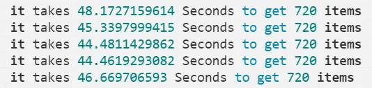 it takes44.4811429862 Seconds to get 720 items