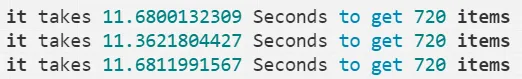 it takes 11.6811991567 Seconds to get 720items }