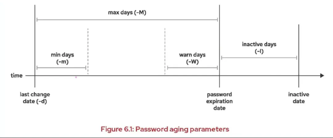 #只有root用户可以使用passwd命令更改用户密码的时间信息-n(--minimum=DAYS)设置密码的最小使用天数,在该天数内用户不能更改密码。-x(--maximum=DAYS)设置密码的最大使用天数,超过该天数后用户必须更改密码。-w(--warning=DAYS)设置在密码到期前多少天开始向用户发出警告。-i(--inactive=DAYS)设置密码过期后账户保持活动状态的天数,超过该天数后账户将被锁定。-e(--expire)强制用户在下次登录时更改密码。-d(--delete)删除用户的密码,即使用户账户没有密码。这会让用户无需输入密码就能登录系统,但这种方式存在安全风险,通常不建议使用。-S(--status)显示用户密码的状态信息,包括密码是否锁定、上次更改密码的日期、密码的最大和最小使用天数1.将密码最小有效期设置为1,默认是0,然后测试普通用户是否可以更改密码2.修改密码,然后将密码最大有效期设置为10天,密码到期前警告日期设置为7,密码到期后的宽限日期设置为10(1)将系统时间增加5天,然后登录用户,你会发现系统会提醒你密码快到期了,提示你修改自己的密码,测试密码到期前警告日期的功能。(2)将系统时间再增加10天,然后登录用户,你会发现系统提醒你密码到期了,但是由于宽限日期没到,所以系统允许你立刻修改密码,测试密码到期前宽限日期功能。(3)将系统时间再增加10天,然后登录用户,由于密码过期且宽限日期也到了,所以用户无法登录。#只有root用户可以使用chage命令更改用户密码的时间信息-m,--mindays:设置用户必须等待多少天才能再次更改密码。例如,设置testuser 至少 7 天才能再次更改密码-M,--maxdays:指定用户密码的最大有效期,即用户必须在多少天内更改密码。比如,将testuser 的密码最大有效期设置为 90 天-W,--warndays:设置在密码到期前多少天开始向用户发出警告。例如,在testuser 密码到期前 14 天开始警告-I,--inactive:设置密码过期后,用户账户可以处于非活动状态的天数。若超过这个天数,账户将被锁定。例如,设置testuser 密码过期 10 天后账户进入非活动状态-E,--expiredate:设置用户账户的过期日期。可以使用标准日期格式或从1970 年 1 月 1 日起的天数。例如,将 testuser 的账户设置为 2025 年 12 月 31 日过期-l,--list:列出指定用户的密码有效期和相关设置信息。-d,--lastday:用于设置用户最后一次修改密码的日期。可以使用标准日期格式(如YYYY-MM-DD)或从 1970 年 1 月 1 日起的天数来表示。通过设置不同的日期值(按照 YYYY-MM-DD 格式或从 1970 年 1 月 1 日起的天数),通过调整用户密码最后修改的记录时间,进而影响密码有效期相关的计算和提醒机制,在一些特定的管理场景中,比如需要调整一批用户的密码更新周期,使其符合统一的时间规划时,是非常有用的。特殊用法是将上次修改密码时间设置为0,相当于passwd的-e参数。