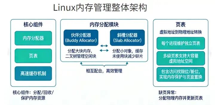 Linux内存管理的整体架构由多个组件协同工作,共同完成内存资源的分配、回收和保护等任务。其中,内存分配器、页表以及高速缓存机制构成了内存管理架构的核心部分。内存分配器负责将物理内存划分为大小不等的块,并根据应用程序的需求分配和释放这些内存块。Linux内核中常用的内存分配器包括伙伴分配器(Buddy Allocator)和斜槽分配器(Slab Allocator)。伙伴分配器主要用于分配大块内存,采用二叉树结构管理空闲内存块;而斜槽分配器则专注于分配小对象,通过缓存已分配但未使用的内存块来减少碎片并提高分配效率。这两种分配器相互配合,确保了Linux系统能够在不同场景下高效地管理内存资源。
