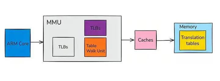 每个 TLB entry 通常不仅包含物理地址和虚拟地址,还包含诸如内存类型、缓存策略、访问权限、地址空间 ID(ASID)和虚拟机 ID(VMID)等属性。如果 TLB 不包含处理器发出的虚拟地址的有效转换,称为 TLB Miss,则将执行外部转换页表查找。MMU 内的专用硬件使它能够读取内存中的转换表。
