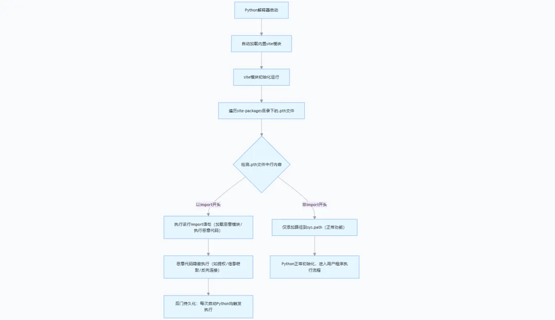.pth 持久化后门依托 Python 官方设计机制,利用 python 解释器启动时自动加载内置的 site 模块,利用site 模块去执行 site-packages 目录下 .pth 文件中“import”开头的代码,从而实现代码的隐蔽执行与权限持久化。