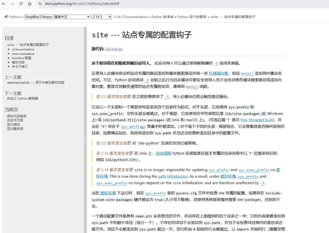 官方说明可以看这里:https://docs.python.org/zh-cn/3.14/library/site.html#