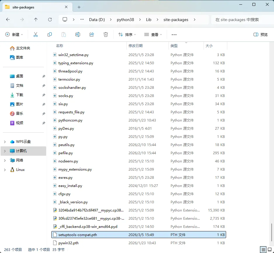 distutils-precedence.pth ← 真实存在的文件名setuptools-compat.pth ← 看起来像 setuptools 的兼容层pip-system-certs.pth ← 看起来像证书配置_virtualenv.pth ← 看起来像 virtualenv 的配置certifi-system-store.pth ← 看起来像证书存储配置