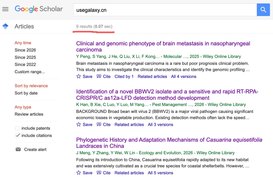 你或许是第一次听说 Galaxy 生信云平台,但是 Google Schoolar 显示,已经有 9 位小伙伴基于平台完成生信分析发表了文章: