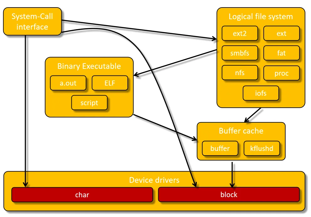 架构组成:包含系统调用接口、逻辑文件系统、缓冲区缓存、二进制可执行文件解析模块、设备驱动,其中缓冲区缓存(Buffer cache) 通过数据缓存提升存储介质的访问性能,kflushd守护进程负责缓存与物理设备的同步;