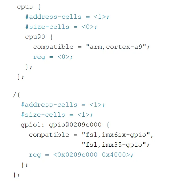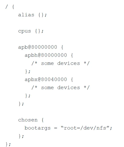 核心顶层节点:根节点下包含cpus(描述CPU信息)、memory(定义RAM的位置和大小)、chosen(向内核传递启动参数,如内核命令行)、aliases(定义节点快捷方式),以及总线、板载设备等节点。