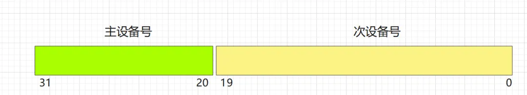 @include/linux/kdev_t.h7#define MINORBITS 208#define MINORMASK ((1U << MINORBITS) - 1)910#define MAJOR(dev) ((unsigned int) ((dev) >> MINORBITS))11#define MINOR(dev) ((unsigned int) ((dev) & MINORMASK))12#define MKDEV(ma,mi) (((ma) << MINORBITS) | (mi))主次设备号内存组成如下: