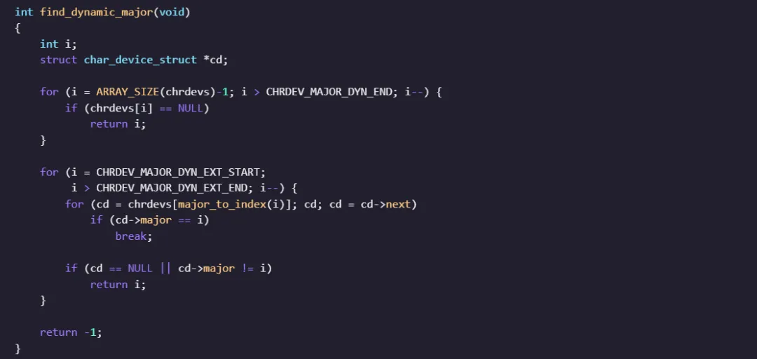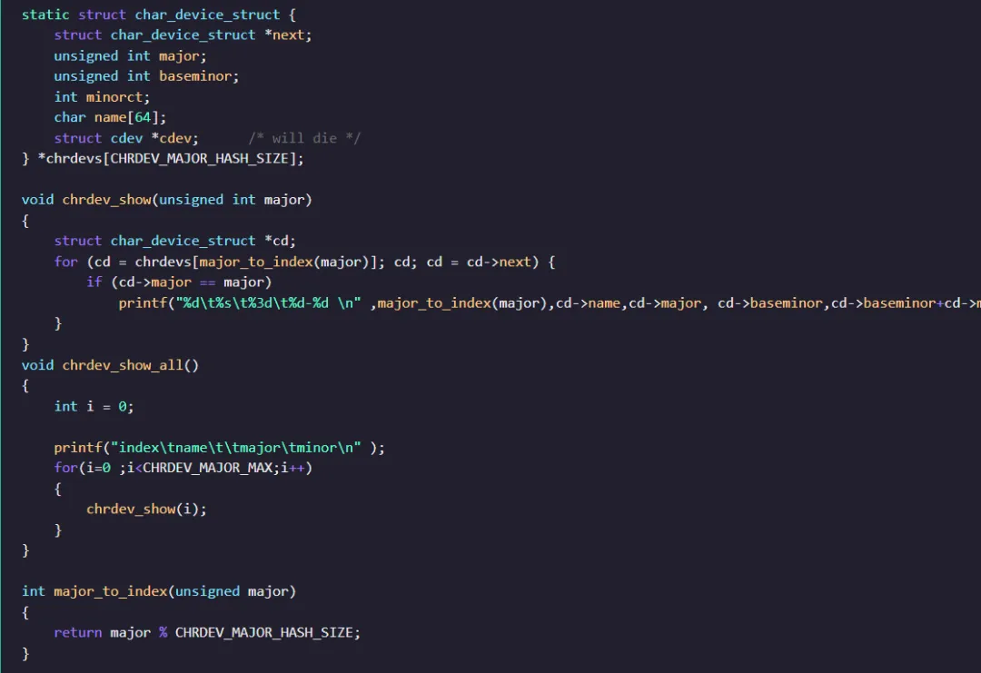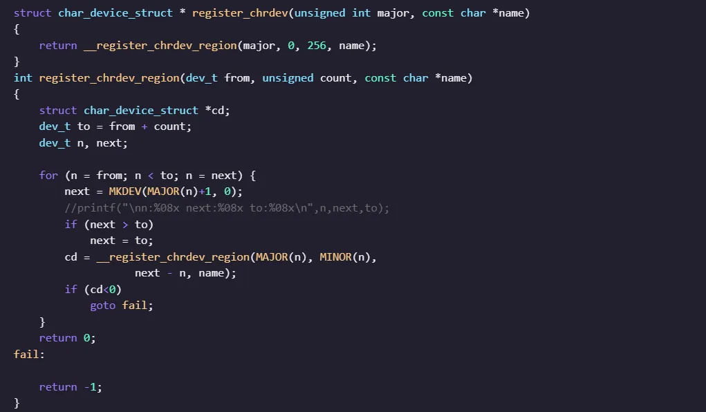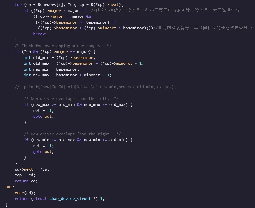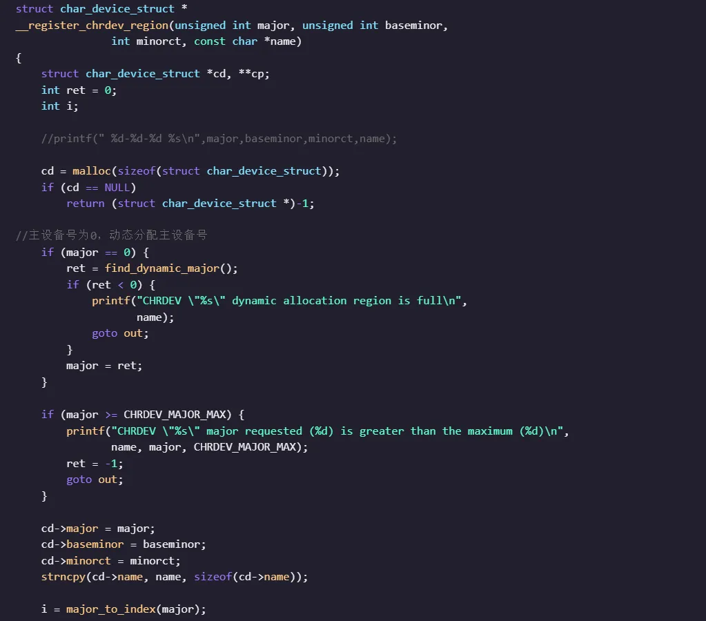 为方便验证代码,彭老师从内核中将字符设备号申请注册的核心代码单独拎出来,去掉一些内核特定函数,