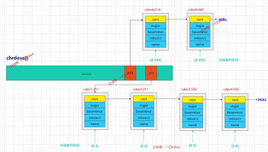 register_chrdev_region(MKDEV(251,0),3,"cdev1"); /* 1 */ register_chrdev_region(MKDEV(251,3),4,"cdev2"); /* 2 */ register_chrdev_region(MKDEV(506,0),3,"cdev3"); /* 3 */ register_chrdev_region(MKDEV(506,3),4,"cdev4"); /* 4 */ register_chrdev(234,"cdevA"); /* 5 */ register_chrdev(489,"cdevB"); /* 6 */申请成功之后,节点信息如下: