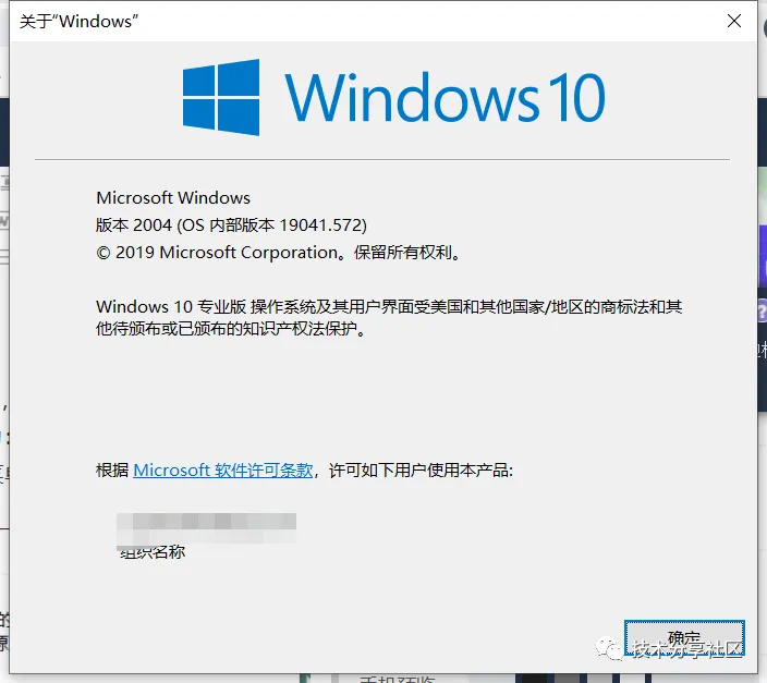 按win(键盘窗口键)+R,输入winver命令,出现系统版本号信息,我的系统版本号为:19041.572