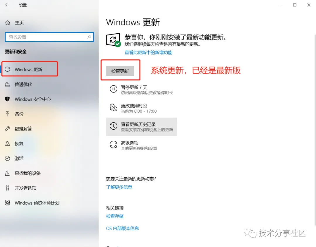 若版本号较低,可在开始菜单----设置-----更新和安全-----Windows更新中更新一下版本。